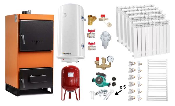 Pachet Centrala pe combustibil solid Fiama W 25 kW, Calorifere aluminiu, Boiler Termoelectric, Vas Expansune, Pompa si Fitinguri MontajPachetul este compus din urmatoarele Componente:1. Centrala pe combustibil solid Fiama W 25 kW;2. Set Radiatoare (calorifere) din aluminiu Fornello G600F, set accesorii radiator aluminiu, radiator port prosop pentru baie si robineti tur/retur format din: Radiator (calorifer) din aluminiu Fornello G600F 10 elementi, 20 ani garantie, inaltime 600 mm - 5 buc; Set accesorii radiator (calorifer) aluminiu format din 11 piese - 5 set;Reductii 1'x1/2""= 4 buc (doua buc stanga si doua bucati dreapta)Aerisitor manual 1/2"" -1 bucDop 1/2"" - 1 bucCheie aerisitor - 1 bucConsole - 2 bucDibluri console - 2 bucSet robineti tur/retur - 6 set;Radiator port prosop pentru baie 400 x 800 mm – 1 buc;3. Boiler termoelectric cu o serpentina Fornello Optima GCVS 1004415 D09 TR 1S, 100 Litri, 1500 watt, reglaj extern al temperaturii, poliuretan expandat;4. Vas expansiune 50 litri;5. Pompa circulare 25-60 si olandezi;6. Kit fitiguri montaj de baza (acest set nu include toate fitingurile, sunt doar cele de baza principale, restul se vor achizitiona impreuna cu instalatorul sau firma care va efectua montajul) format din:- Grup de siguranta;- Termostat de contact - 1 buc;- Filtru Y 1"" - 1 buc;- Robinet trecere 1"" - 2 buc;- Robinet golire 1/2"" - 1 buc;Centrala pe combustibil solid Fiama W 25 kWCazanele cu combustibil solid Fiama W sunt concepute pentru a arde lemne. Aceste cazane ofera o solutie economica pentru incalzire. Cazanele au capacitati diferite pentru nevoi diferite. Cazanele Fiama W sunt usor de utilizat si ofera o incalzire confortabila. Functioneaza in tiraj natural cu termostatul sau mecanic cu lant. Nu exista alte componente electrice decat pompa de circulare care se achizitioneaza separat.Avantajele folosirii unei centrale pe combustibil solid Fiama W 25 kWFoloseste cele mai ieftine surse de incalzire, pretul inferior al combustibilului folosit care poate fi lemn sau carbune, este de pana la 2-3 ori mai mic decat pretul celorlalte surse de incalzit;   Ramanane cea mai simpla si accesibila solutie atat pentru incalzirea locuintei, cat si pentru prepararea de apa calda menajera care se poate realiza prin intermediul unui boiler cu serpentina (termoelectric), fiind foarte utila in zonele unde nu exista retea de gaze naturale, putand inlocui cu succes clasicele sobe;Durata lunga de viata fara probleme, costuri de exploatare si intretinere reduse, fiind un cazan clasic fara automatizari, probabilitatea de a avea o avarie este foarte redusa;Centrala poate fi utilizata in spatii cu o suprafata peste medie, care poate ajunge chiar si la 150 de metri patrati;Este o centrala eficienta, cu un randament ridicat;Lemnul este ars integral, fumul rezultat fiind curat, fara impact asupra mediului;Intretinere facila, cu descarcarea cenusii de cateva ori pe luna;Elementele centralei pe combustibil solid Fiama W 25 kWA- Termostat cu lant termostatic (regulator de tiraj)B- Usa camerei de ardereC- Usa camerei de ardere inferioara D- Supapa de aerE- Racord Retur F- Racord TurG- Alimentare si golireØ- Diametrul Cosului de fumSPECIFICATII TEHNICE