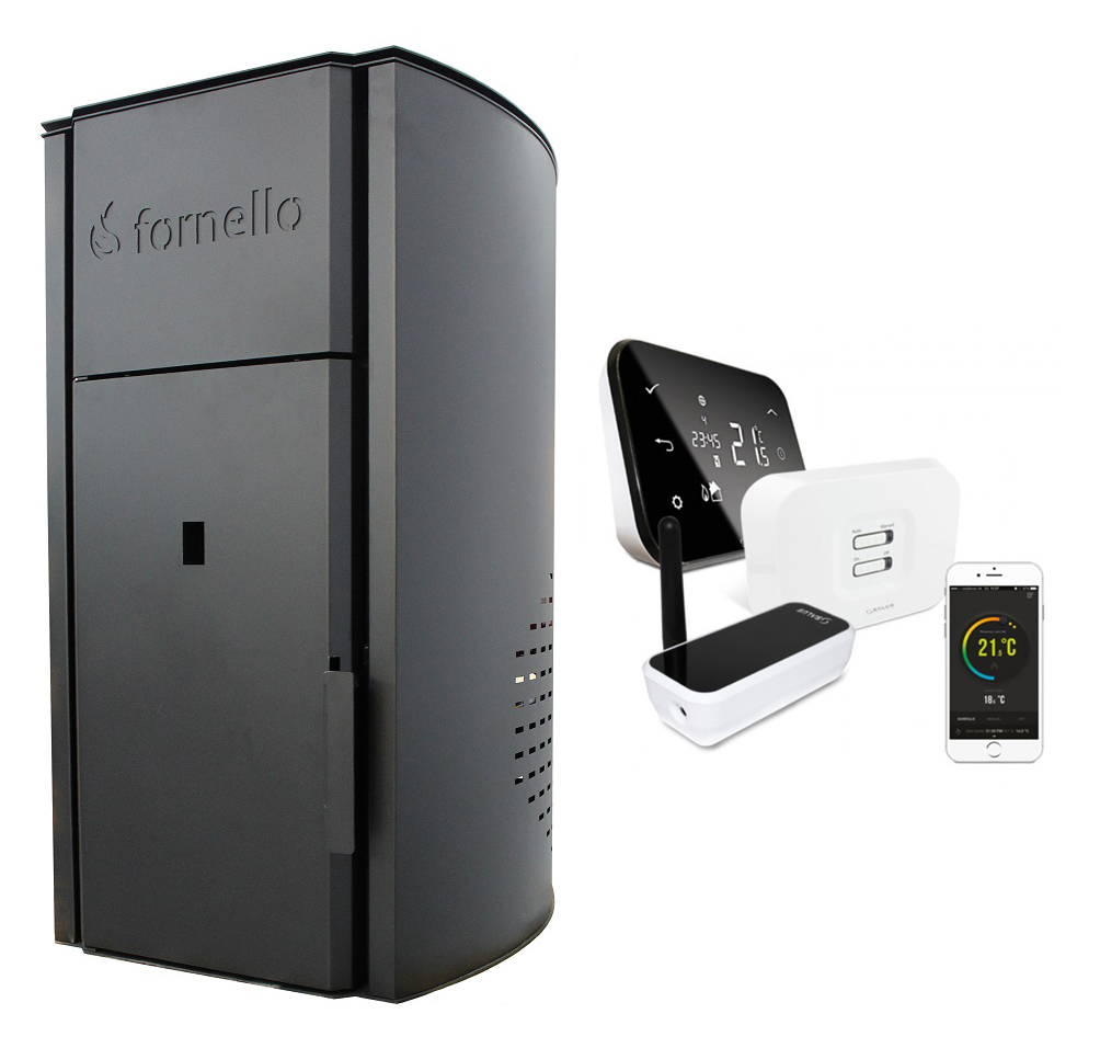 Pachet control de la distanta Centrala pe peleti Fornello Royal BLACK 30 kw, complet echipat cu pompa de circulatie, vas expansiune, supapa de siguranta, buncar 30 kg, automatizare, culoare negru, pana la 200 mp si termostat Wi-Fi Salus IT 500