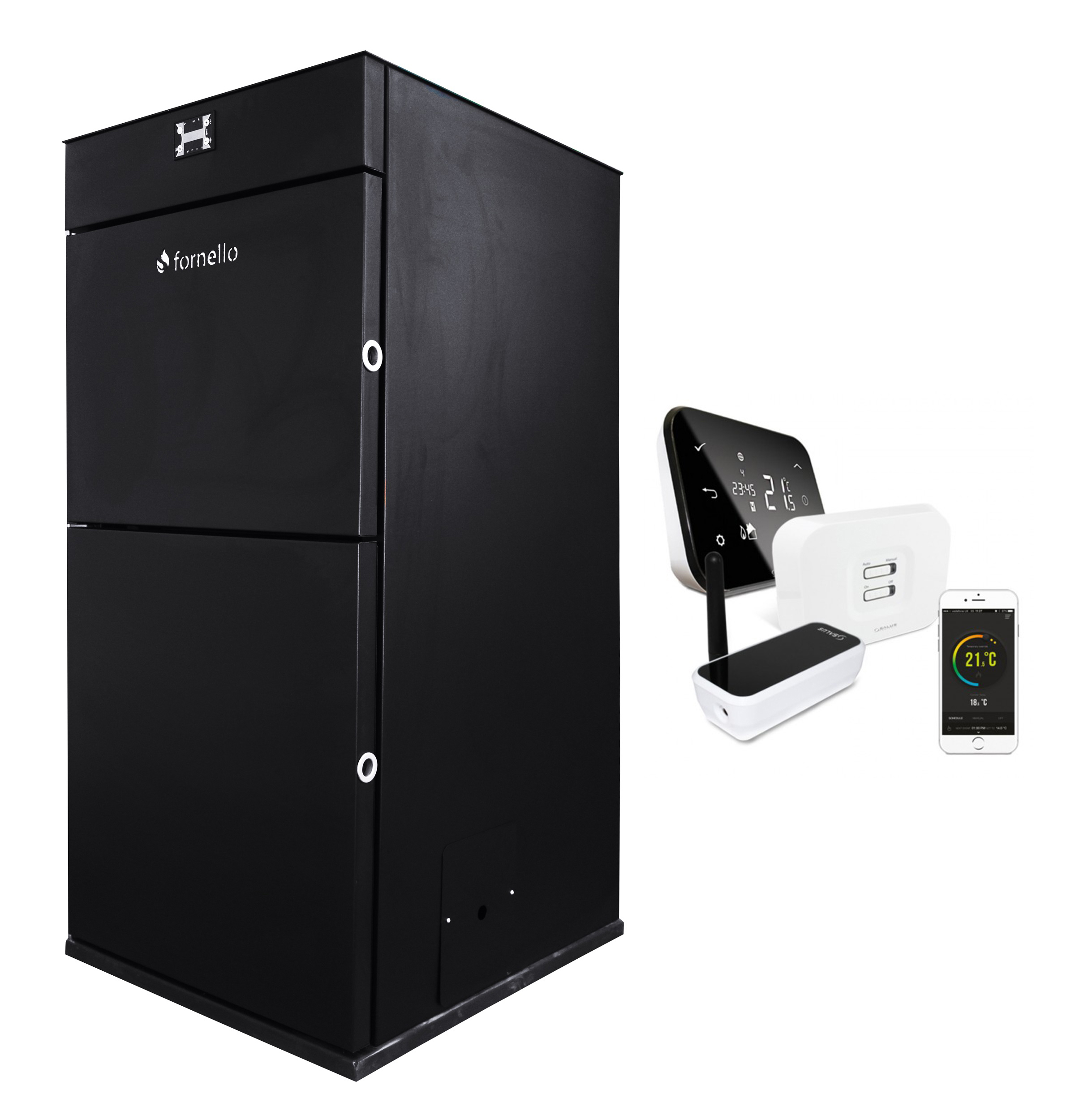 Pachet control de la distanta Centrala peleti Fornello Pellet King 30 kw, pompa, vas expansiune, automatizare , telecomanda, buncar peleti 70 kg, tiraj fortat, culoare neagra, curatare facila, pana la 200 mp si termostat Wi-Fi Salus IT 500Pachetul este format din:1. Centrala peleti Fornello Pellet King 30 kw2. Termostat ambiental controlat prin internet SALUS IT 500Termostatul iT500 comandat prin Internet, va ofera libertatea de a controla caldura in orice moment, de oriunde v-ati afla.Pentru o setare rapida, puteti alege unul dintre cele trei programe prestabilite, sau va puteti crea propriul program in functie de stilul de viata.Caracteristici:Programarea apei calde cu 3 porniri/opriri si functie boost pana la 3 ore.Simplitatea adaugarii programelor de incalzire.Alegeti dintre TOATE, 5/2 sau zile INDIVIDUALE.Alerte geo-locatie, atunci cand sunteti la o anumita distanta de casa, reminder pentru setarea modului vacanta sau optiunea care va intreaba daca doriti pornirea caldurii pentru a avea o locuinta incalzita atunci cand va intoarceti acasa.Tutoriale simplu de urmarit despre cum sa utilizati aplicatia.Pentru mai multe detalii despre instalare si utilizare, va rugam sa descarcati instructiunile.In cazul in care nu reusiti sa va logati sau sa inregistrati termostatul iT500 de pe smartphone App, va rugam sa folositi adresa alternativa: LOGARE APLICATIE SALUS DIN INTERFATA WEB AICI!Termostatul iT500 va functiona corespunzator si in cazul in care conexiunea la Internet va fi intrerupta temporar. CENTRALA PE PELETI FORNELLO Pellet King 30 KW, echipata cu: pompa de circulatie, vas de expansiune, supapa de siguranta, automatizare, telecomanda, rezervor pentru peleti, tiraj fortat -Centralele monobloc pe peleti au dimensiuni compacte, usor de instalat si exploatat, autonomie ridicata data de un buncar de peleti de 70 kg.Camera de ardere a centralei FORNELLO este protejata de o camasa de apa de suprafata mare, pentru o eficacitate mai mare.Pentru evacuarea gazelor arse se poate utiliza o tubulatura de evacuare de 80 mm in diametru. Nu necesita cos de fum clasic, este suficienta tubulatura de evacuare de diametru 80 mm cu inaltime de 3,5 metri.AVANTAJEBuncar de dimensiuni mari, 70 kg , autonomie marecuratare foarte facila fara demontarea carcasei curatare usoara a drumurilor de fum fara demontarea carcaseiProces de ardere ecologic si eficientControler inteligent.Control de la distanta prin telecomandaArzator pe peleti, buncar de peleti, pompa de circulatie si vas de expansiune incorporat.COMBUSTIBIL RECOMANDATPeleti de lemn, ø 6÷8 mm AVANTAJE CONTROLERComod si usor de instalat.Software sigur si cu o functionare flexibila.Functii clare si concrete pentru utilizator.Functii avansate pentru service.Senzor pentru gazele de ardere de pana in 500 °C.Senzor pentru centrala.FUNCTII CONTROLERSetarea alimentarii cu peleti.Gestioneaza functionarea pompei de circulatie a sistemului de incalzire.Setarea gradelor de ardere.ELEMENTELE Centralei pe peleti FORNELLO Pellet King 30 kw1 – Comanda (controller)2 – Capacul rezervorului pentru peleti3 – Rezervor pentru peleti4 – Usa metalica5 – Manerul usii6 – Sertar de cenusa7 – Arzator pe peleti8 – Alimentare electrica9 – Panouri decorative lateraleSPECIFICATII TEHNICE FORNELLO Pellet King 30 KWPutere nominala 30 kWCapacitate termica minima 13.5 kWInaltime H 1400 mmLatime 650 mmAdancime 750 mmIesire / Intrare manta de apa stut ø 1”El. рuterea /Puterea partii electrice V/Hz/WGreutate kg 230Conducta evacuare gaze mm ø80 Temperatura gazelor de evacuare °С < 180Consum mediu combustibil per ora h/kg 1,3Fabricat in Europa