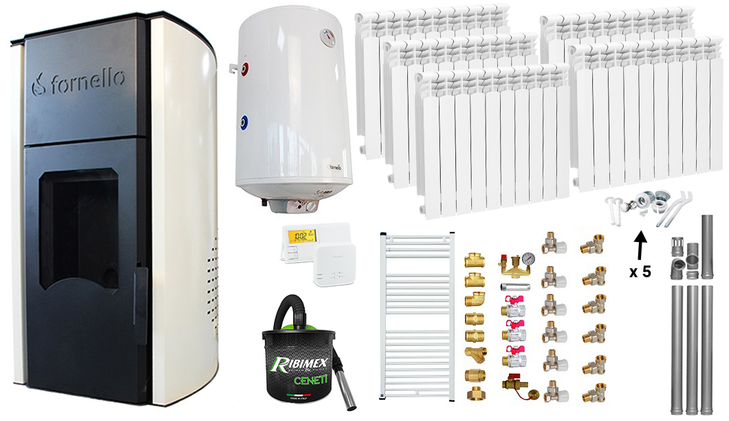 Pachet Termosemineu peleti Fornello Royal Ivory 25 kw, complet echipat, pompa circulatie, vas expansiune, automatizare, Calorifere aluminiu, Boiler, kit evacuare 3.5 ml, Aspirator Cenusa, Termostat Salus 091FLRFV2 si FitinguriPachetul contine urmatoarele produse:1.Termosemineu peleti Fornello Royal Ivory 25 kw, complet echipat pentru incalzire, pompa circulatie, vas expansiune, automatizare , telecomanda, buncar peleti, tiraj fortat, culoare Ivory , aprindere automata.2. Kit de evacuare (cos de fum) Fornello, otel, diametru 80 mm, etansare cu garnitura, 3.5 m lungime, culoare negru, complet echipat pentru montaj, ce contine urmatoarele elemente: 1 x Dop 1 x Cot 1 x Teu 1 x Grila 3 x Tub 1 metru 1 x Tub 0.5 metri3. Boiler termoelectric Fornello Titanium Plus 100 litri; Volum 100 litri Tensiune electrica 230 V Putere electrica 2000 W Energie electrica 9,1 A Greutate gol / umplut : 37 / 137 kg Supapa de siguranta - inclusa4. Aspirator pentru cenusa Ribimex Cenerill, 1000 W, 18 l, 220 V;Aspiratorul Cenerill este destinat curatarii cenusii din seminee, sobe cu lemne, sobe pe peleti ori gratare. Acesta vine in ajutorul dumneavoastra cu un motor puternic, de 1000 W, si un rezervor de 18 litri, caracteristici ce fac procesul de curatare rapid si usor.Caracteristici si beneficii: Design modern; Maner din metal, pentru transport; Filtru HEPA lavabil, substituibil; Canistra din metal; Cablu de alimentare 1.5 m; Include furtun flexibil din metal (1.10 m) si duza aspiratie metalica (20 cm); Usor de manevrat, datorita greutatii reduse de aproximativ 3.5 kilograme.5. Termostat digital wireless Salus 091FLRFV2Caracteristici:• Afisaj LCD cu iluminare;• 9 programe, din care 6 presetate si 3 modificabile de catre utilizator;• 3 nivele de temperatura: de zi, noapte si antiinghet;• Posibilitatea de schimbare a histerezei (diferenta la pornire);• Frecventa de comunicare este 868MHz, oferind stabilitate semnalului la interferente;• Facilitatea schimbarii codului de comunicare;• Distanta de comunicare este de pana la 60m in spatiu deschis.Specificatii:• Intervalul temperaturii de lucru: 0 ~ 40°C• Histereza (diferenta la pornire): 0.5°C / 1°C• Intervalul de programare a temperaturii: 5°C~ 30 °C• Pasul de masurare al temperaturii: 0.2 °C• Numarul de programe: 9• Nivele de temperatura: 2 + antiinghet• Alimentare: 2 baterii tip AA6. Set Radiatoare (calorifere) din aluminiu Fornello G600F, set accesorii radiator aluminiu, radiator port prosop pentru baie si robineti tur/retur format din: Radiator (calorifer) din aluminiu Fornello G600F 10 elementi, 20 ani garantie, inaltime 600 mm - 5 buc; Set accesorii radiator (calorifer) aluminiu format din 11 piese - 5 set;Reductii 1'x1/2""= 4 buc (doua buc stanga si doua bucati dreapta)Aerisitor manual 1/2"" -1 bucDop 1/2"" - 1 bucCheie aerisitor - 1 bucConsole - 2 bucDibluri console - 2 bucSet robineti tur/retur - 6 set;Radiator port prosop pentru baie 400 x 1200 mm – 1 buc;7. Kit montaj (14 piese) Centrala/ Termosemineu pe peleti Fornello Royal, Fiamma King 25 format din: Teu alama 1” – 1 buc; Stut filetat zincat de 15 cm marime 1” – 1 buc; Grup siguranta 1” – 1 buc; Cot alama Fi-Fe 1” – 1 buc; Robinet trecere Fi-Fe 1” – 2 buc; Niplu alama 1” – 1 buc; Filtru Y 1” – 1 buc; Prelungitor alama redus ¾ - ½ Fi-Fe – 1 buc; Teu alama ½ - 1 buc; Robinet golire ½ - 1 buc; Niplu alama ½ - 1 buc; Supapa unic sens alama ½ - 1 buc; Robinet trecere ½ Fi-Fe – 1 buc;Termosemineu pe peleti Fornello Royal Bordeaux 25 KW, aprindere automata, telecomanda, buncar tiraj fortat, pompa circulatie, vas expansiune, BordeauxTermosemineul pe peleti Fornello 25 KW poate asigura incalzirea in toata casa. Pe langa aspectul placut si designul frumos, aceasta soba poate functiona ca o centrala termica pentru ca se poate racorda la calorifere. Are un rezervor de peleti ce trebuie umplut periodic. Arderea peletilor se face cu eficienta de 90 – 93% si autonomia la soba pe peleti variaza in functie de izolatia casei, temperatura exterioara si alti factori ajungand la intervale cuprinse intre 15 pana la 36 ore. Pentru o functionare buna trebuie folositi peleti de inalta calitate cu diametru de 6 mm, care sunt arsi cu un consum de 0,8 /- 3 kg/h in functie de treapta in care functioneaza.. Cosul pentru evacuarea gazelor arse are racordul de 80mm la soba si trebuie scos in exteriorul cladirii. Un grad sporit de confort este asigurat de functionarea automata si programarea saptamanala. Astfel soba pe peleti poate merge automat fara sa intervi asupra ei si poate fi programata sa porneasca si sa se opreasca. Cu ajutorul telecomenzii poti creste temperatura de ambianta stand confortabil pe fotoliu, fara sa trebuiasca sa te deplasezi. Descriere si avantaje semineu pe peleti:- Produs NOU din gama ecologica pentru functionare cu peleti;- Fara risc de intoxicare • Sistem controlat electronic;- Autoaprindere;- 5 trepte de reglare a vitezei de ardere;- Functioneaza in circuit inchis;- Control pentru temperatura camerei;- Sertar de cenusa mare pentru curatare saptamanala;- Program de lucru saptamanal;Cum setezi temperatura la soba pe peleti: Se poate seta temperatura de la panoul de control si se poate face programare saptamanala sau se poate seta sau modifica temperatura manual. Telecomanda pentru soba termosemineu pe peleti este un accesoriu inclus care faca foarte confortabila operarea ei si posibilitatea de comanda de la distanta pentru setarea puterii de ardere dorita. Intretinerea si curatareaZilnic: Se aspira reziduurile din vasul de ardere si camera de combustie. Cu un vatrai se curata gaurile din vasul de ardere. Din cenusar se aspira cenusa depusa. Nota: Foloseste un aspirator corespunzator cu un container special pentru a aduna cenusa. Saptamanal: Sertarul de cenusa se verifica si se goleste de 1-2 ori pe saptamana. Se scoate sertarul si se goleste. Zona de langa el se aspira si se monteaza inapoi sertarul. Intretinerea si curatarea se fac