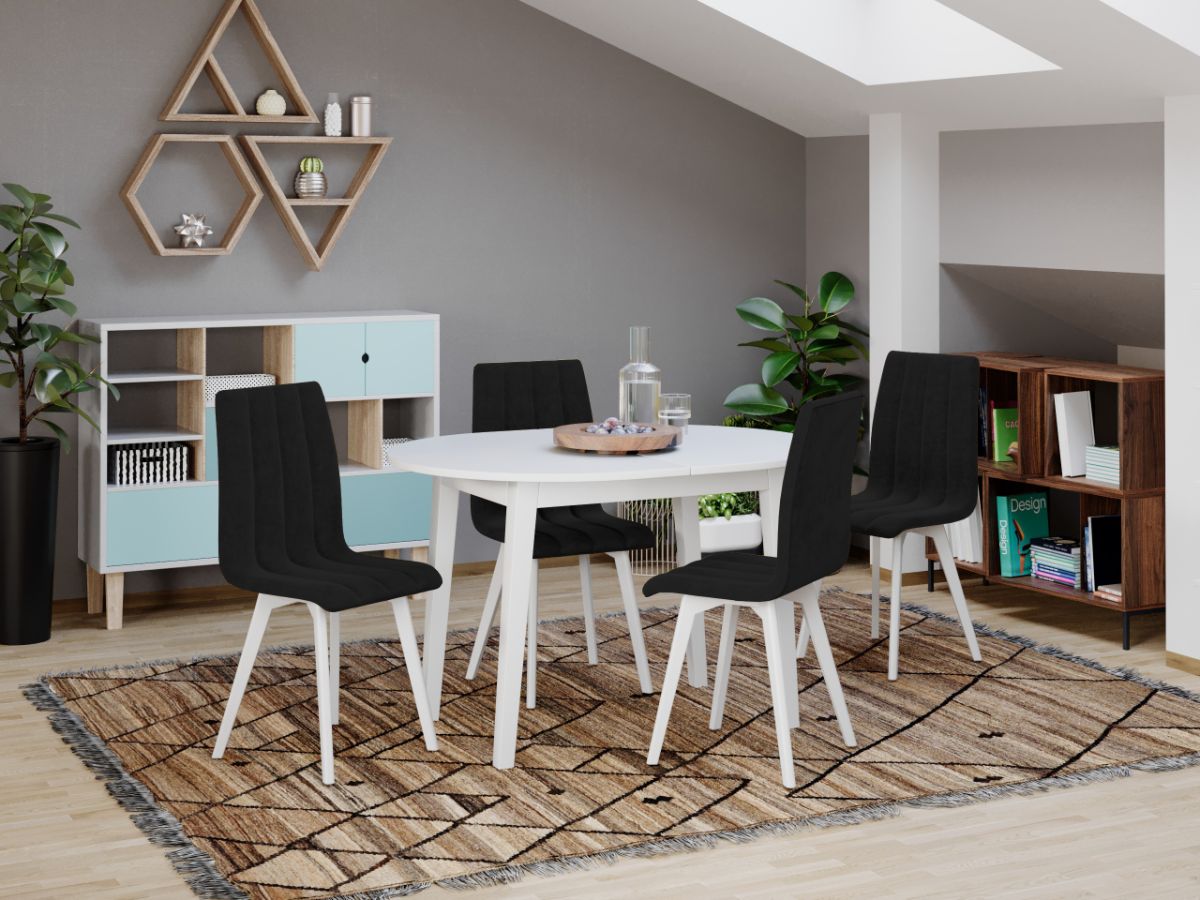 Set Masa Extensibila Rosa + 4 Scaune Karma Tapitate Negru Masa Extensibila Rosa Alba rotunjita are un design modern fara colturi . Formele rotunjite si picioarele din lemn masiv vopsit fac din aceasta masa una aparte. Fara surprize la livrare, diferente de culoare sau calitate Poze reale de produs, fara randari 3D Livrare gratuita si rapida, 4-10 zile lucratoare prin curier Suntem producatori de tapiterii, fara intermediari Toate piesele de tapiterii au o garantie de 2 ani Dimensiuni Masa Extensibila Rosa Alba rotunjita Masa extinsa Lungime 160 cm latime 90 cm Inaltime 77 cm Masa inchisa Lungime 120 cm latime 90 cm Inaltime 77 cm https://youtu.be/2Ib5AlCpqzE Specificatii Masa Extensibila Rosa Blatul este alb din MDF , rezistent la umezeala cu o grosime generoasa de 18 mm . Acesta are colturi rotunjite care pe langa aspectul unic ajuta si la un spatiu suplimentar in camera, prevenirea loviturilor cat si posibilitatea de amplasare a scaunelor pe colt atunci cand aveti un numar mai mare de invitati. Picioarele sunt din  lemn de fag masiv, slefuit si vopsit in alb. Acestea ofera o rezistenta sporita si o durabilitate mare pentru masa. Culoarea este placuta si se poate integra cu usurinta in orice locuinta. Va rugam sa va uitati in galeria foto si puteti vedea modul de extindere. ATENTIE: Imaginile sunt cu titlu de prezentare, in functie de modul in care au fost pozate si de tipul ecranului dumeavoastra, pot diferi culorile / nuantele sau anumite detalii. 4 bucati x Scaun Karma Tapitat Negru Scaun Karma Tapitat Negru este un scaun cu design contemporan. Formele rotunjite si picioarele din lemn masiv vopsit fac din acest scaun unul aparte. Dimensiuni Scaun Karma Inaltime Totala 80 cm Inaltime pana la sezut 46 cm Inaltimea spatarului de la sezut 45 cm Latime spatar sus 36 cm Latime spatar jos 40 cm Adancime sezut 38 cm Latime sezut 42 cm Specificatii Scaun Karma Sezutul si spatarul sunt realizate din  stratificat de 10 mm, acoperit cu poliuretan si stofa . Acestea confera un confort sporit datorita formei anatomice cat si o senzatie placuta la atingere data de tapiteria din stofa. Picioarele sunt din  lemn de fag masiv, slefuit si vopsit  in alb. Acestea ofera o rezistenta sporita si o durabilitate mare pentru scaun. Culoarea este placuta si se poate integra cu usurinta in orice locuinta. Va rugam sa va uitati in galeria foto pana la poza de detaliu pentru stofa pentru a va asigura ca nuanta este cea dorita. ATENTIE: Imaginile sunt cu titlu de prezentare, in functie de modul in care au fost pozate si de tipul ecranului dumeavoastra, pot diferi culorile / nuantele sau anumite detalii.