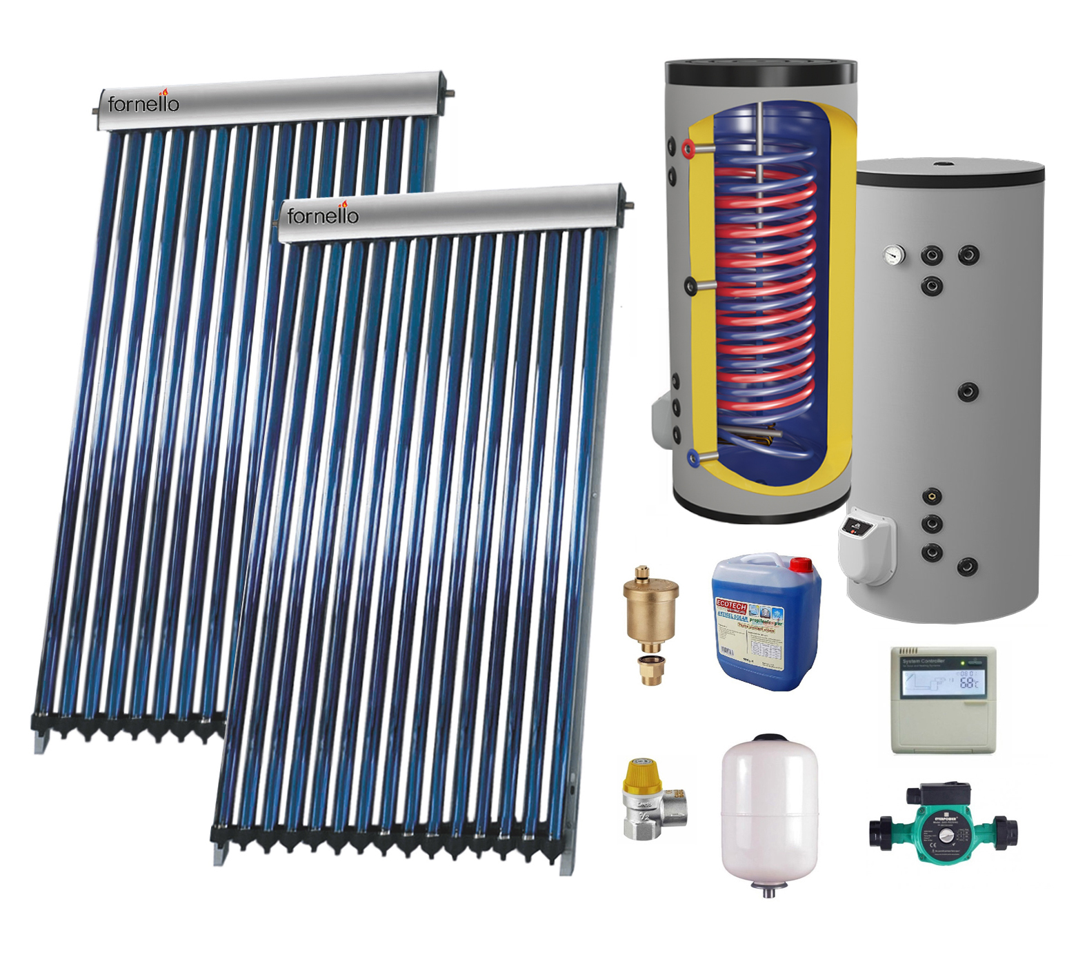 Set Sistem solar presurizat, panou Fornello 40 Tuburi Heat Pipe, boiler cu 2 serpentine si rezistenta electrica Eldom 300 litri cu montaj pe sol, pompa 25-60, controller, vas expansiune, antigel, supapa 1/2, aerisitor 1/2Caracteristici:-Panourile solare split nu necesita montarea boilerului pe acoperis, boilerul poate fi pozitionat oriunde in locuinta, rezultand o pierdere minima de caldura pe timp racoros;-Panoul solar cu boiler bivalent a fost optimizat pentru a furniza apa calda menajera tot timpul anului;-O serpentina se monteaza la panoul solar, cea de a doua serpentina se monteaza fie pentru aport la incalzire, fie la o alta sursa aditionala pentru a incalzi apa menajera din boiler-Poate fi montat pe orice tip de acoperis si pe orice suprafata plana-Circuitul de schimb termic (intre panou si boiler) contine agent termic pe baza de antigel, astfel ca poate fi folosit si pe timp de iarna-Instalatiile de panouri solare cu tuburi vidate heat-pipe aduc economie de 80% la apa calda menajera si 30% la incalzireSetul solar include:1. 2x Panou colectot solar presurizat cu tuburi vidate Heat Pipe Fornello 20 tuburi (total 40 tuburi), destinat producerii de apa calda menajera, montaj pe acoperis inclinat sau fatada2. 2x Set suporti acoperis pentru panou solar 20 tuburi vidate 3. Boiler termoelectric cu doua serpentine Eldom FV30067S21, 9000 W, 300 l, montaj pe sol, 0.8 Mpa4. Supapa de siguranta 6 BAR Supapa de siguranta are rolul de a proteja sistemul dumneavoastra solar impotriva supraincalzirii. Este necesara conectarea iesirii supapei de siguranta la o scurgere sau canalizare, deoarece in cazul supraincazirii, aceasta va evacua apa fierbinte5. Automatizare solara cu 3 senzori de temperatura (1 senzor pentru panou solar, 2 senzori pentru boiler) -Automatizarea solara are rolul de a comanda pompa solara din grupul de pompare-Dotata cu 3 senzori de temperatura (temperatura de la colectorul solar, temperatura din partea de sus a boilerului, respectiv din partea de jos a boilerului)-Microprocesor pentru monitorizarea si controlul colectorului solar, boilerului si pompei de recirculatie.-Display LCD care indica starea de functionare a instalatiei solare-Functii suplimentare: controlul diferentelor de temperatura; temperatura limita, maxima si minima a colectorului solar; temperatura anti-inghet; temperatura maxima de stocare apa calda menajera; racire; functie anti-legionella; functie by-pass; functie de recirculare; mod vacanta (racire);mod manual6. Pompa de circulatie 25-607. Vas de expansiune 36 litri8. Aerisitor automat -1 buc9. 2x Antigel solar preparat 10 litri-Antigel solar pentru instalatii solare propilen glicol aditivat-Temperatura de lucru: -28°C / 180°CPanou colector solar presurizat cu tuburi vidate Heat Pipe Fornello 20 tuburi, destinat producerii de apa calda menajera, montaj pe acoperis inclinat sau fatadaPanourile solare presurizate Fornello sunt panouri solare cu tuburi vidate si tuburi termice (tip heat pipe din cupru pentru o conductivitatea termica foarte buna) montate in interiorul lor. Pot fi folosite in instalatiile de incalzire si de preparare a apei calde de consum menajer pe toata perioada anului.Tubul termic din interiorul tuburilor vidate transforma energia solara in energie termica si o transfera colectorului in care se monteaza toate tuburile termice si care se afla in partea superioara a panoului solar.Agentul termic lichid cu temperatura joasa de vaporizare aflat in interiorul tuburilor termice (heat pipe) este incalzit, se transforma in vapori care se ridica spre partea superioara ingrosata a tubului termic denumita condensator. Vaporii de agent termic condenseaza si isi cedeaza caldura latenta de vaporizare prin condensator catre colectorul panoului solar.Dupa aceea, agentul termic lichid se va intoarce gravitational la partea inferioara a fiecarui tub termic (heat pipe) si ciclul se repeta intr-un mod continuu atata timp cat tubul termic este incalzit de soare.Tuburile vidate din sticlă sunt componenta cheie a colectoarelor solare cu tuburi vidate.Fiecare tub evacuat este format din două tuburi de sticlă. Tubul exterior este realizat din sticla borosilicata transparenta extrem de puternica,capabila sa reziste la impactul cu grindina cu un diametru de pană la 25 mm. si tubul interior este facut tot din sticlă borosilicat, invelita cuun strat special (Al-N/CU), cu proprietati excelente in absorbtia caldurii solare si minima reflexie. Aerul este vidat din spatiul dintre celedoua tuburi de sticla pentru a forma un vacuum,care elimina pierderea de caldura conductiva si convectiva.Teava Heat Pine reprezinta doua tevi dispuse concentric cu vacuum intre ele. Suprafata tevii interioare este acoperita cu un strat selectiv, ce permite o absorbtie maximala a razelor solare, pierderi minimale si un coeficient de performanta (COP) inalt. In centrul tevei Heat Pipe se afla o teava mica de cupru goala , in care se initiaza procesele de evaporare a unui fluid netoxic, care preda temperatura spre varful ei si o trimite catre nodul colector, de unde se incalzeste agentul termic. Procesele se repeta din nou si din nou.AVANTAJELE PANOURILOR SOLARE PRESURIZATE CU TUBURI TERMICE (HEAT PIPE):nu exista pericolul de spargere pe timpul iernii (deoarece tuburile termice nu contin apa ci un agent termic cu temperatura joasa de vaporizare si care nu ingheata);structura compacta adaptabila usor locului de montaj;panourile functioneaza neintrerupt chiar in cazul s-a spart un tub vidat;temperatura de pornire este in jur de + 25 °C, temperatura la care agentul termic din tubul termic incepe sa vaporizeze.Panourile solare Fornello tipul SP sunt produse în modele cu 10, 15, 20, şi 30 de tuburi. AMPLASAREA PANOURILOR SOLARE PRESURIZATE CU TUBURI VIDATE HEAT PIPEAlegerea locului potrivit este foarte important pentru amplasarea panourilor solare.De obicei, locul ideal pentru montarea panourilor solare este pe acoperis, insa, daca ai o curte mare, poti sa le montezi pe sol.Indiferent de lo